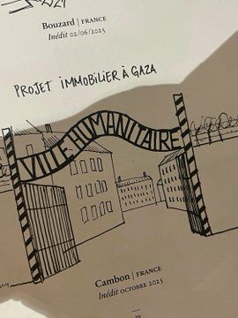 - Une illustration intitulée « Projet immobilier à Gaza », figurant une entrée dite « humanitaire » surmontée de barbelés, dans une symbolique explicite étant la copie conforme de l’entrée de camps de concentration Auschwitz-Birkenau,.