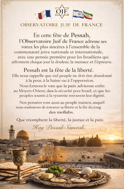 À l’occasion de Pessah, nous adressons à l’ensemble de la communauté juive, en France, en